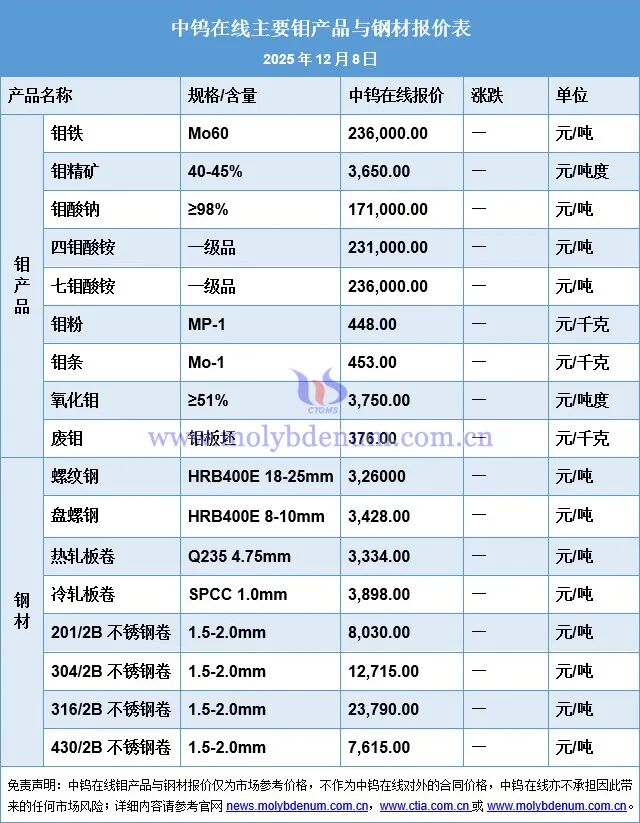 2025年12月8日钼价和钢价一览盈丰配资